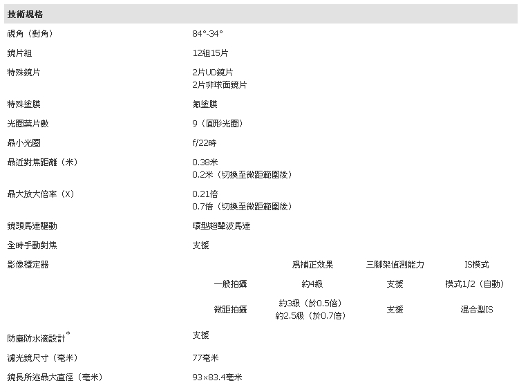首先看一下Canon EF 24-70mm F4L IS USM的詳細規格: