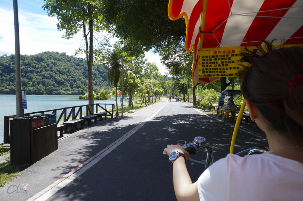 雖然環湖路上非常平坦,但還是有高低起伏的,只有左前座有一煞車可使用,我們就因為車速過快,煞不急,我這個坐後座的差點就撲出去了