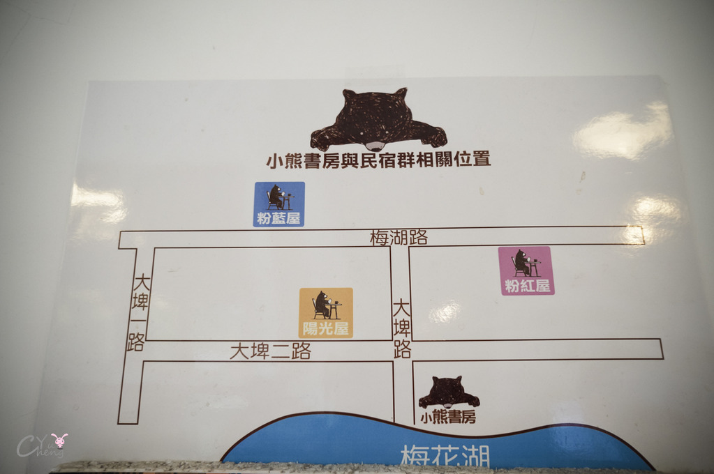 但一開始我們確實就走錯了,他也叫小熊書房沒錯啊,但只是走到了人家的民宿去了,所以小熊書房列了張地圖出來,就是在防呆阿,不管什麼粉紅屋、陽光屋的,那都是民宿,要用餐得先直接走到湖畔,往左手邊便可以看到拉。