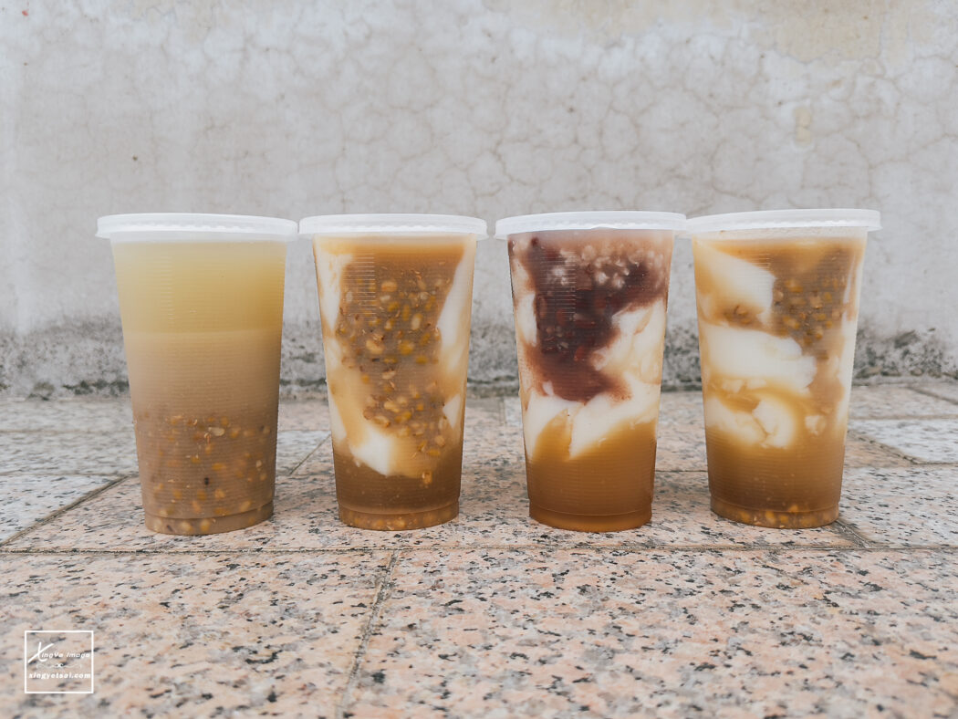 從左到右是:顆粒綠豆湯、綠豆豆花、紅豆薏仁豆花、綠豆豆花