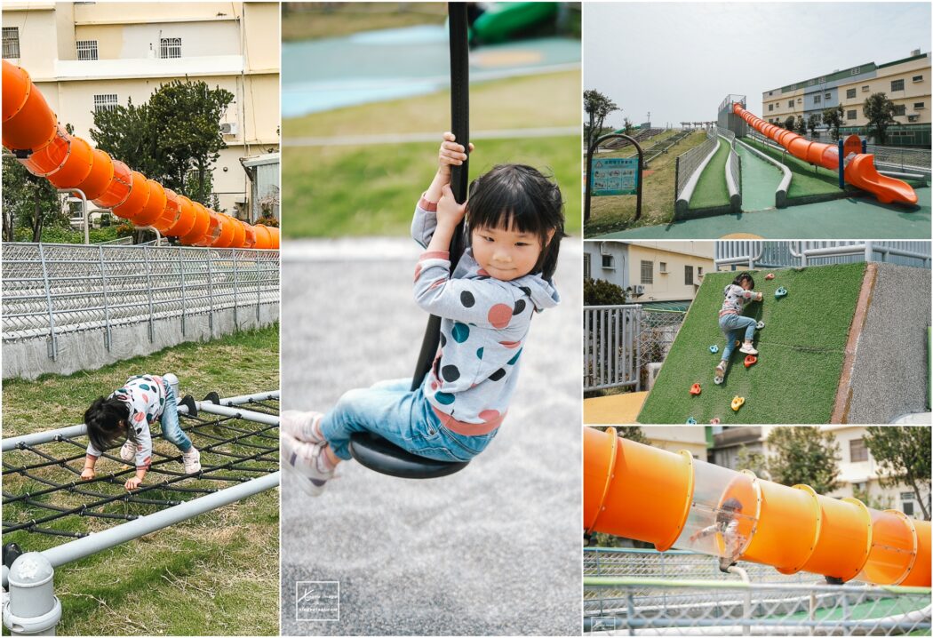 ▲超長溜滑梯、滑草區,看起來很厲害的溜滑梯,不過實際上不太滑,所以不會危險,只是要上溜滑梯前,有個攀岩區需要挑戰,三歲多的阿珊已經獨立完成了,一路溜滑梯下來,阿珊的心得是「很不滑耶,要自己嚕下來」哈哈哈!而且在溜滑梯旁也有很長的滑草道,如果有自備滑草板的朋友們,一定要嘗試看看!