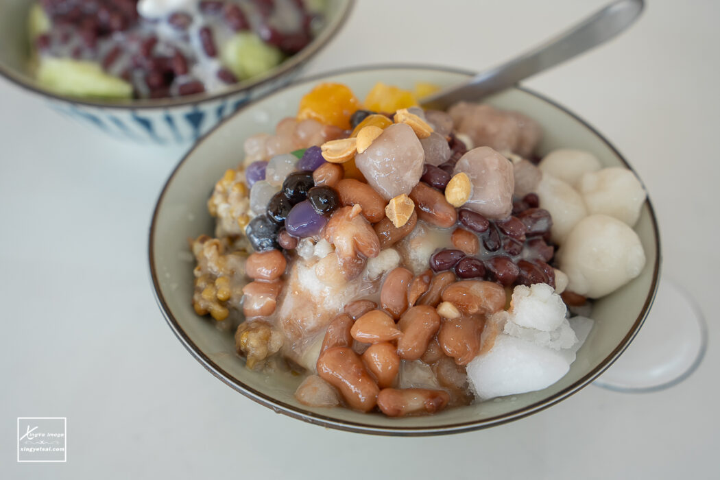 ▲紅豆、大豆、綠豆、彩色粉圓、仙草、水果、芋圓、湯圓與薏仁,冰品上方還會灑上超好吃的硬花生!因為配料完全把冰品的基底遮住了,所以我要特別分享冰品的基底的口味,有著清冰的清爽,但沒有雪花冰的容易膩口,真的超級好吃,吃完這碗整個飽到晚餐吃不下!