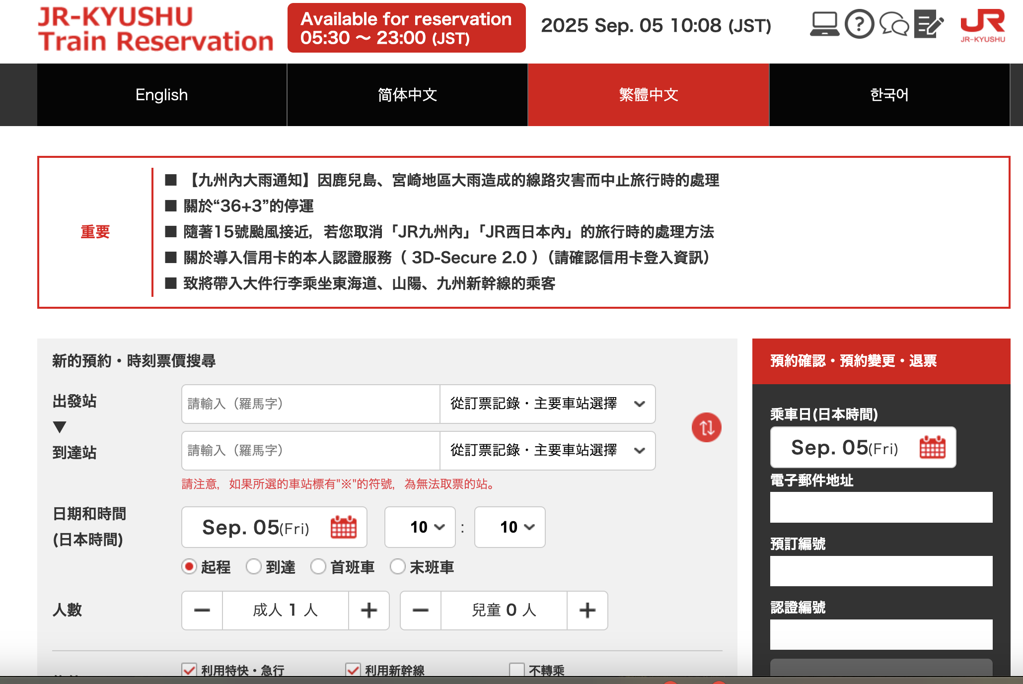 JR九州新幹線、在來線訂票網站(有提供繁體中文):https://train.yoyaku.jrkyushu.co.jp/inbound/pc/Top/zhtw