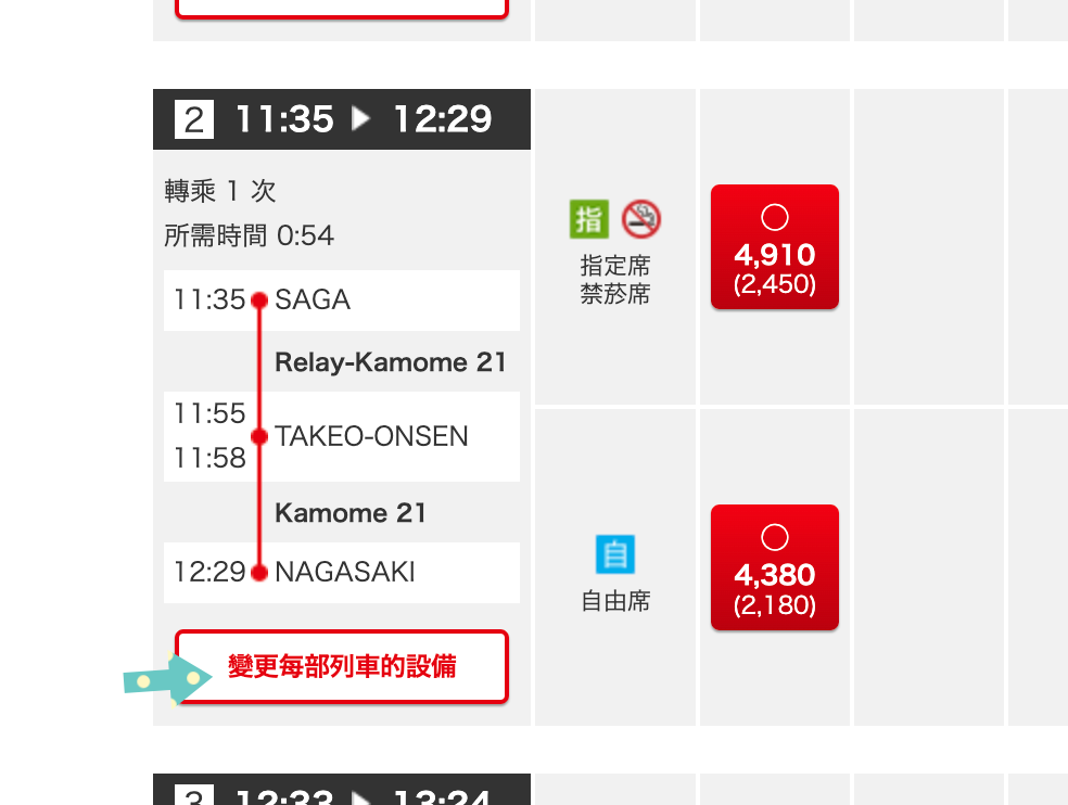 ▲之後依照你喜歡的時間班次選擇,如果你想先預訂特大行李放置處附帶席,記得不要看到指定席與自由席就點入,要點“變更每部列車的設備”