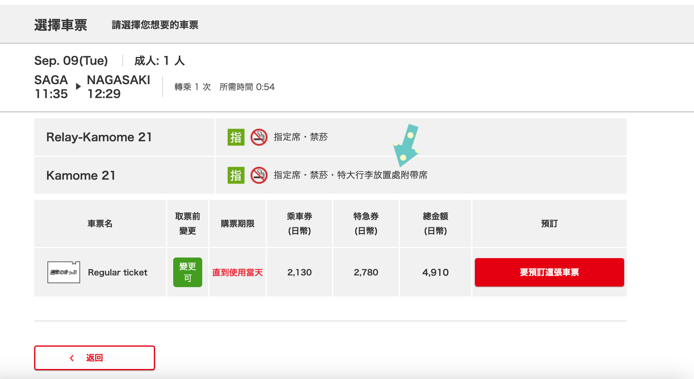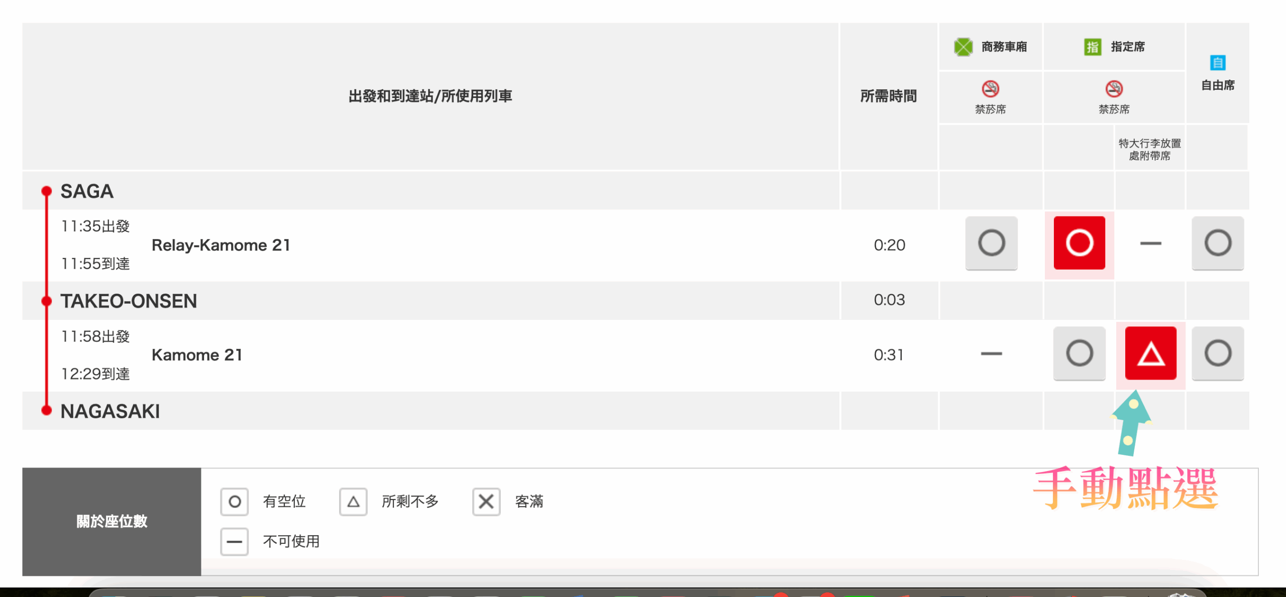 ▲就可以來到這個頁面,想要點選商務車廂、指定席與自由座都可以,不過切記特大行李放置處附帶席只有指定席有提供,且只有在日本西九州新幹線KAMOME海鷗號(武雄溫泉-長崎)才需要喔