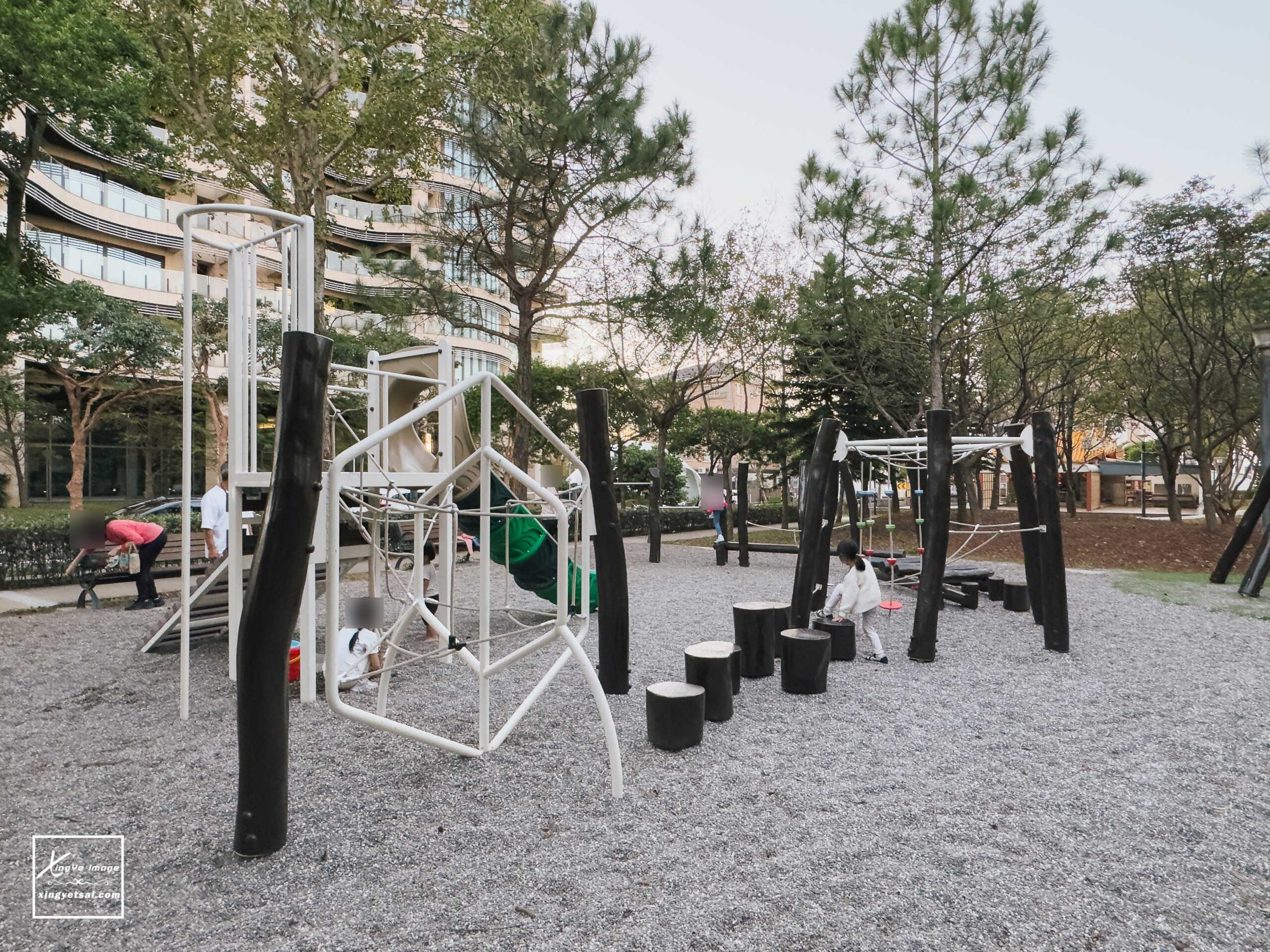 ▲使用圓木形狀打造的遊戲場,很有森林感,讓人一眼看見就很喜歡,該有的遊戲場設施都有:溜滑梯、平衡木攀爬設施、小單槓與礫石沙坑等,缺點是遊戲場的腹地太小,然後設施不多