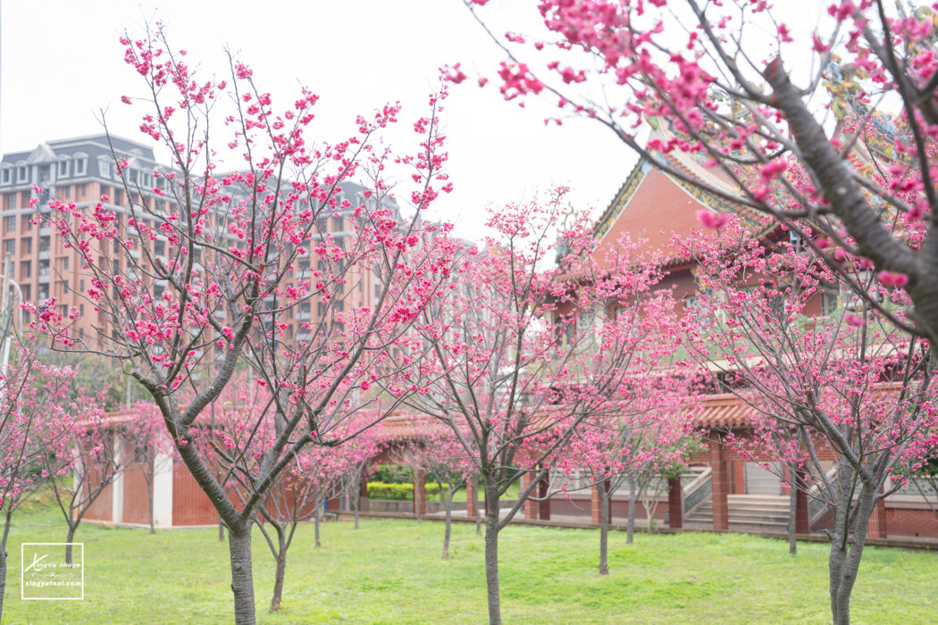 ▲青昇宮的櫻花很集中,櫻花林雖然規模不比山區,但搭配青昇宮紅磚綠瓦的廟宇建築,層次感非常豐富,特別的美!不過要注意櫻花林有小圍欄,原則上不能貼近櫻花樹拍攝的喔!