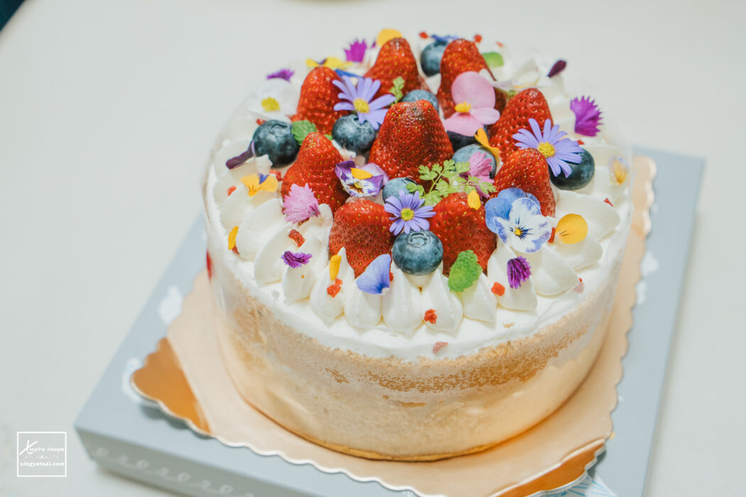 ▲這顆蛋糕最吸引我的,莫過於表面裝飾了大量的食用花,繽紛的色調讓整體視覺氛圍像是落在美麗的花叢裡,隨手一拍都充滿藝術感!且對於怕膩口的我們家來說,這款蛋糕的鮮奶油比例較少,吃起來負擔感輕很多,細緻的戚風蛋糕體搭配輕盈奶油,很符合家裡的甜點習慣